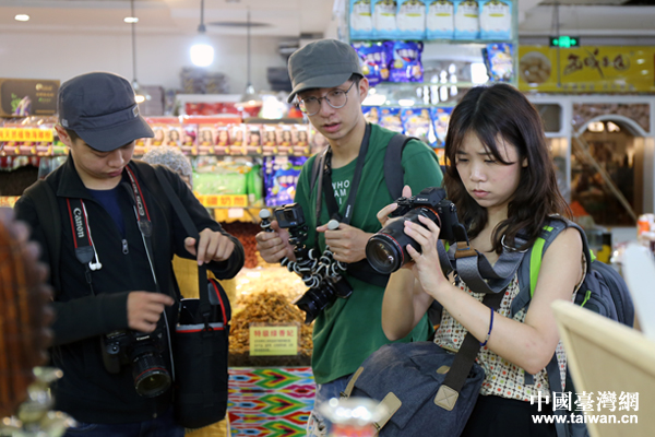 来自台湾的三位90后自媒体达人在新疆国际大巴扎专注拍摄。(中国台湾网 王怡然 摄)