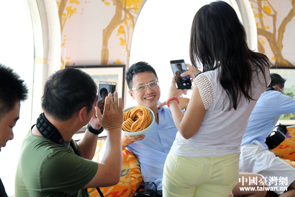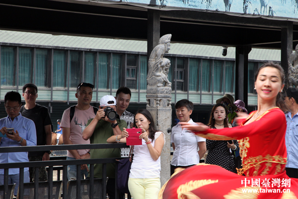 台湾自媒体达人被新疆舞者的表演所吸引。(中国台湾网 王怡然 摄)