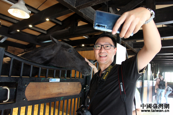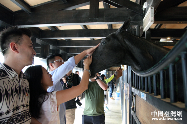 来自台湾的自媒体达人与汗血马近距离互动。(中国台湾网 王怡然 摄)
