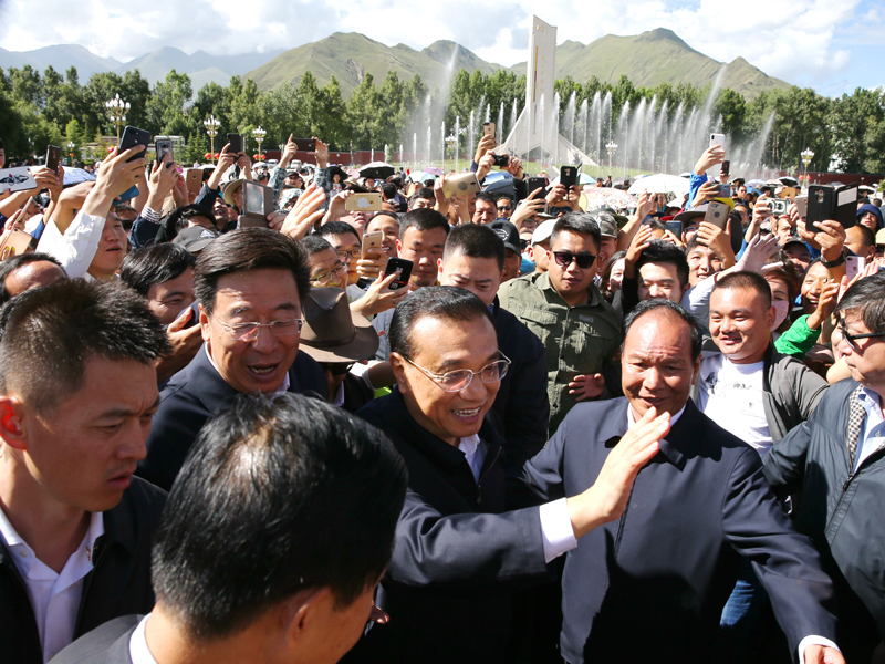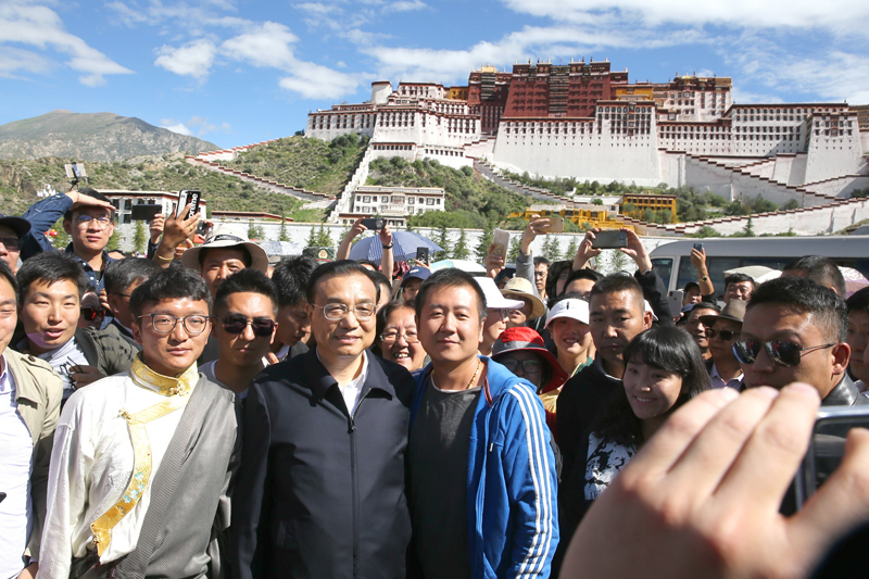 李克强总理7月27日考察布达拉宫文物保护之后,来到布达拉宫广场。看到总理到来,广场上的市民游客迅速围得里三层外三层,争相与总理握手。李克强说,从你们的笑容中和精神面貌上我能感受到这里的气氛祥和安宁,衷心祝愿大家生活安康,扎西德勒!有游客高声喊,“总理能不能和我们一起照张相?”李克强欣然应允。市民游客们纷纷拿出各自的手机,有的自拍,有的交换手机相互帮着拍,密集的拍摄声此起彼伏。